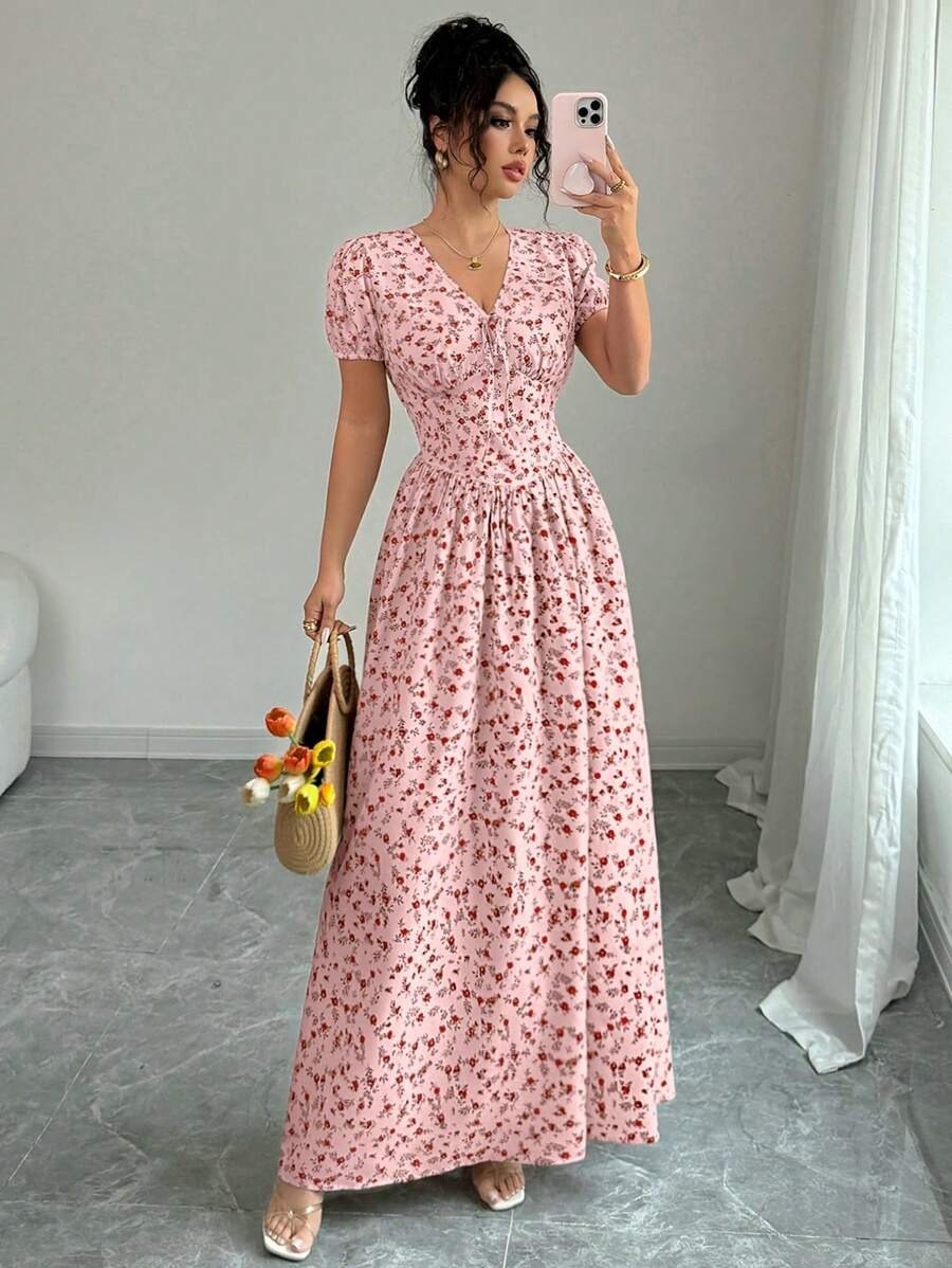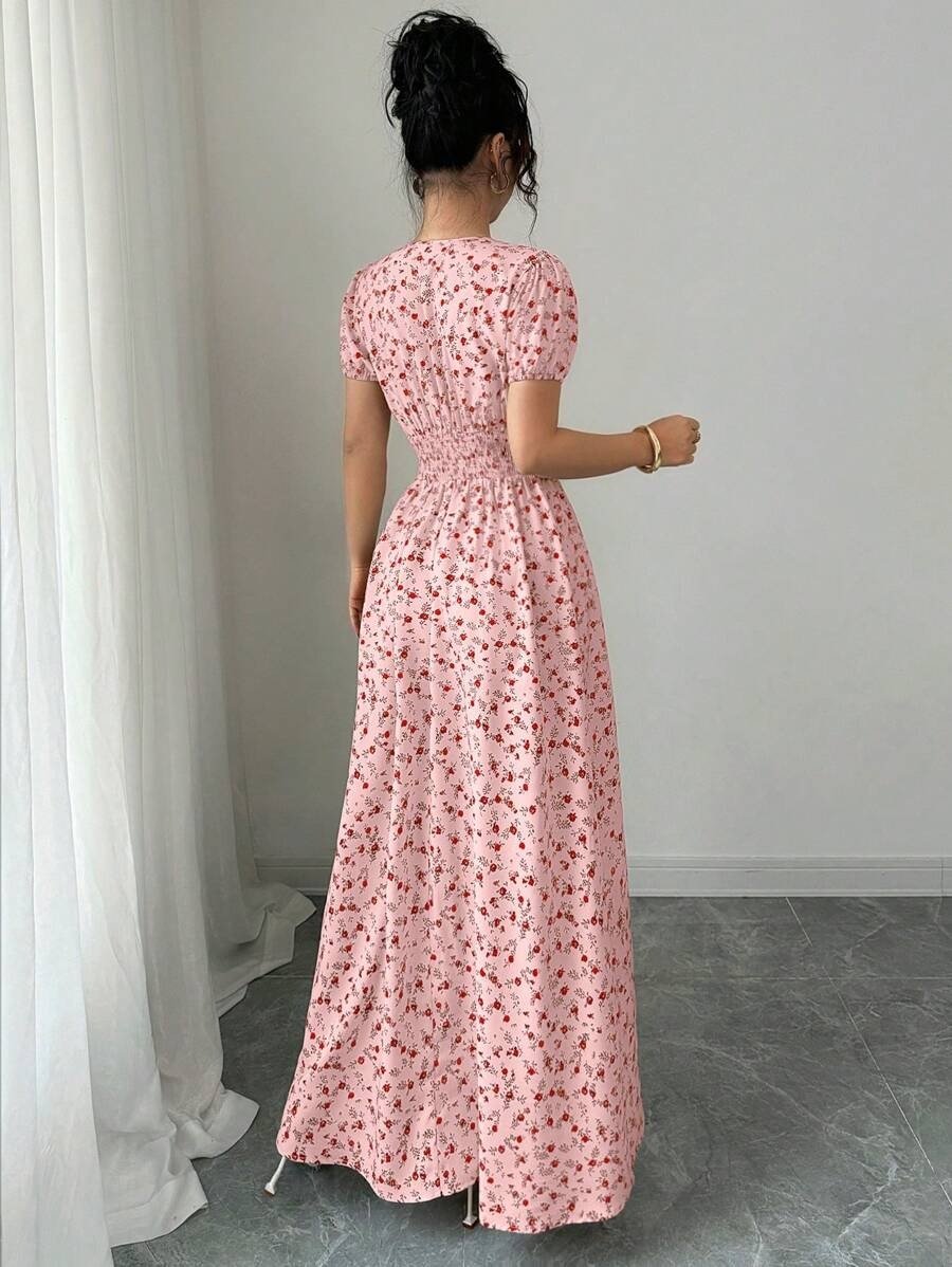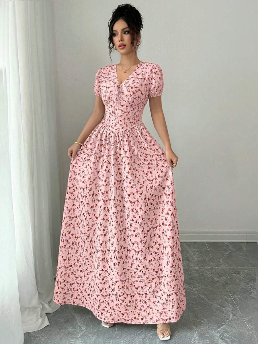 Elegant Women’s Summer Elegant Elastic Waist Puffed Sleeve Women’s Long Dress,Maxi Dress Suitable For Daily Commute, Music Festival, Holiday Wear/Draped/Countryside Flowers/Pastoral Style