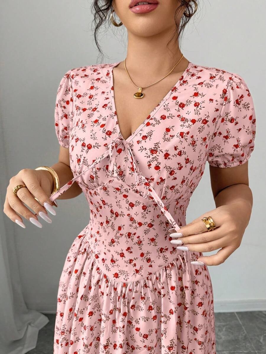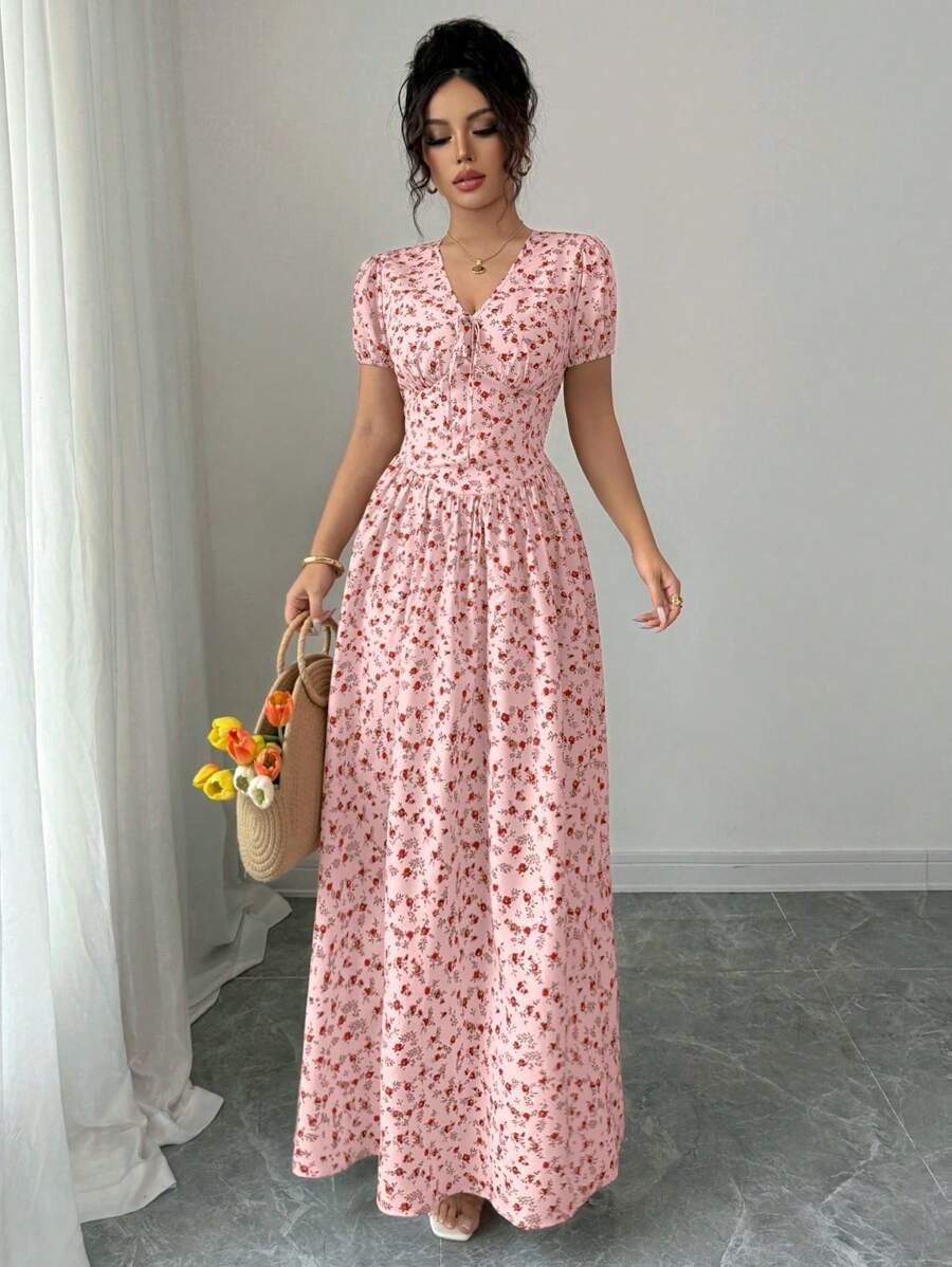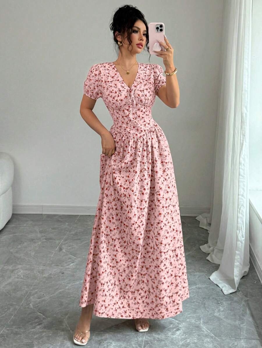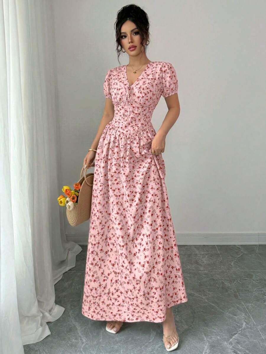 Elegant Women’s Summer Elegant Elastic Waist Puffed Sleeve Women’s Long Dress,Maxi Dress Suitable For Daily Commute, Music Festival, Holiday Wear/Draped/Countryside Flowers/Pastoral Style