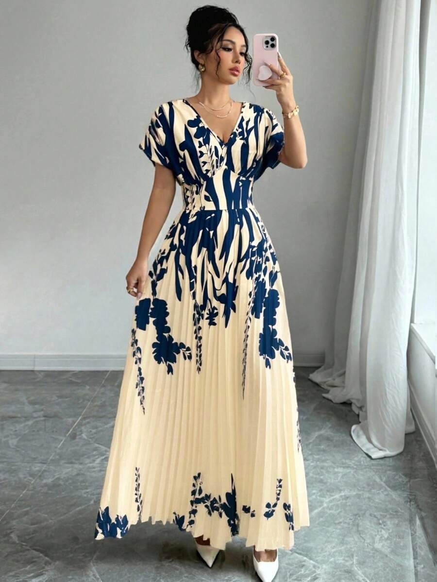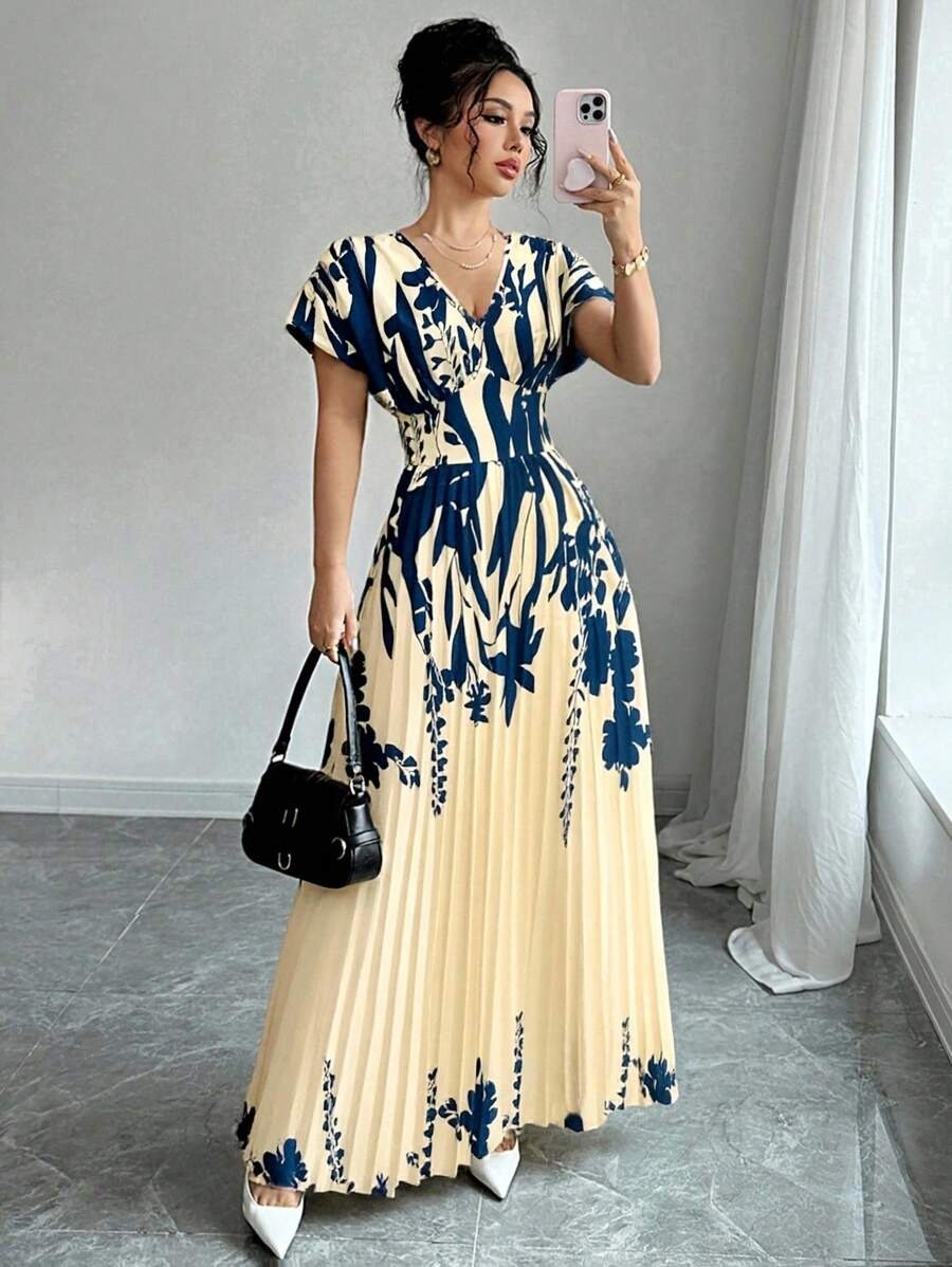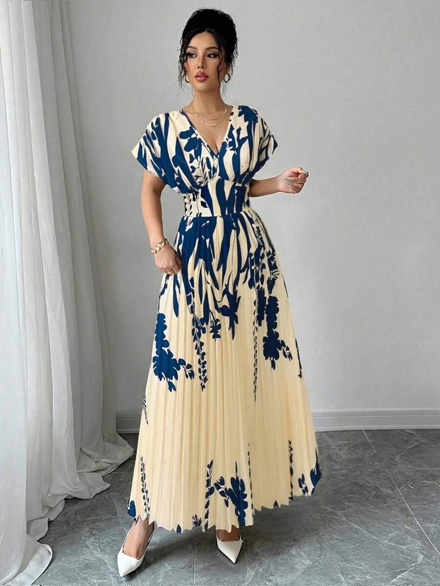 Elenzga Bottom Hem Pleat Structure Strapless, Elastic Waist Dress For Women V-Neck Floral Cinched Waist Flattering Floral Print Long Dress For Women For Spring/Summer, Elegant For Spring/Summer/Fall/Winter Season, Concert Women’s Clothing, Elegant, Evening Gowns, Suitable For Everyday, Commute, Wedding Season/African Dresses For Women/Bandage Dresses/Fall,Back To School