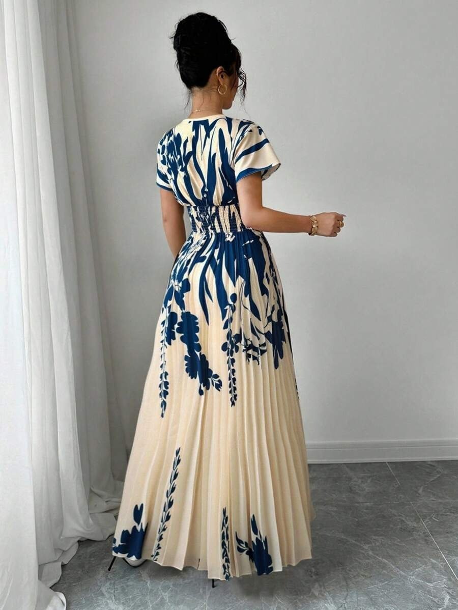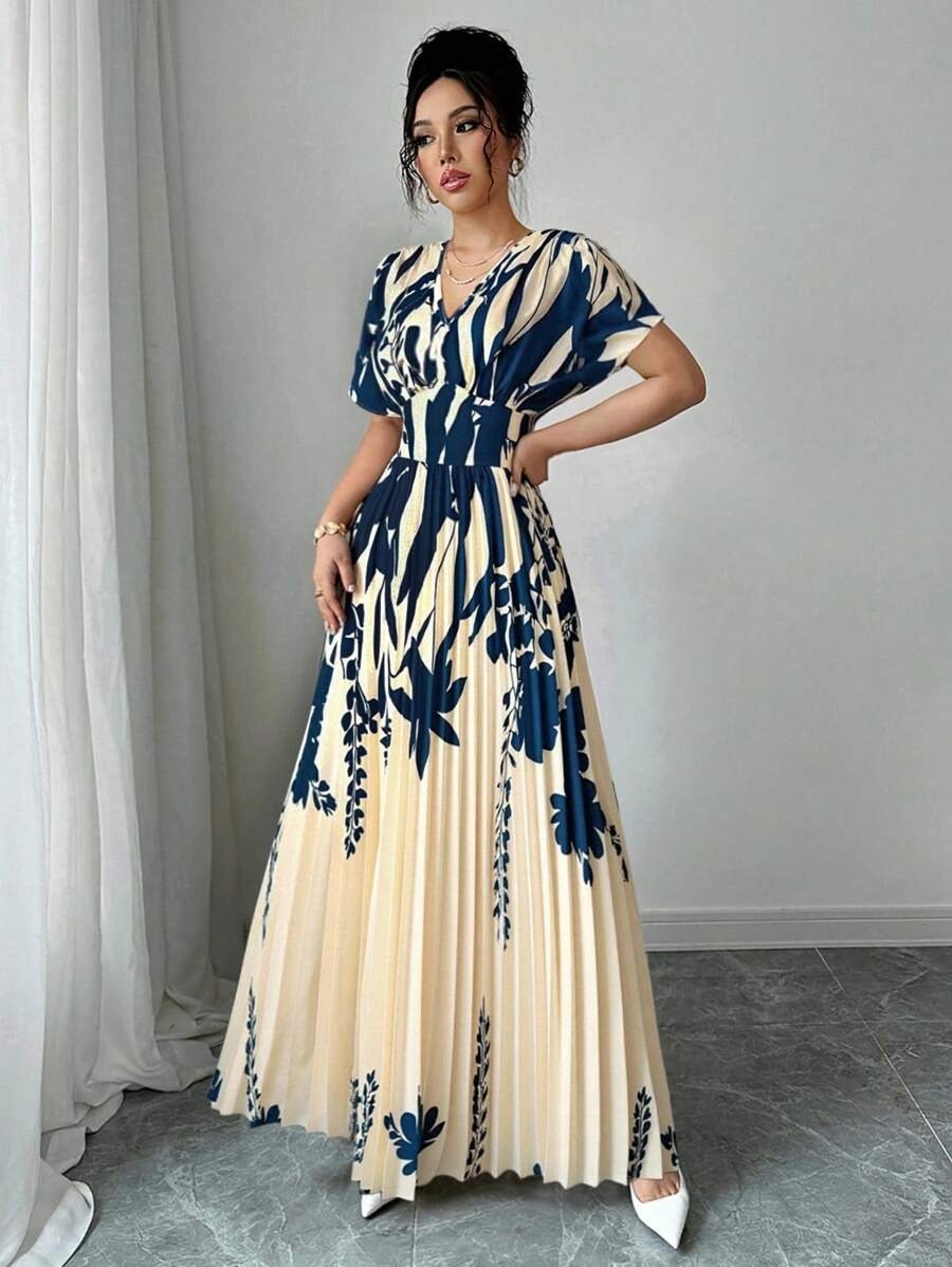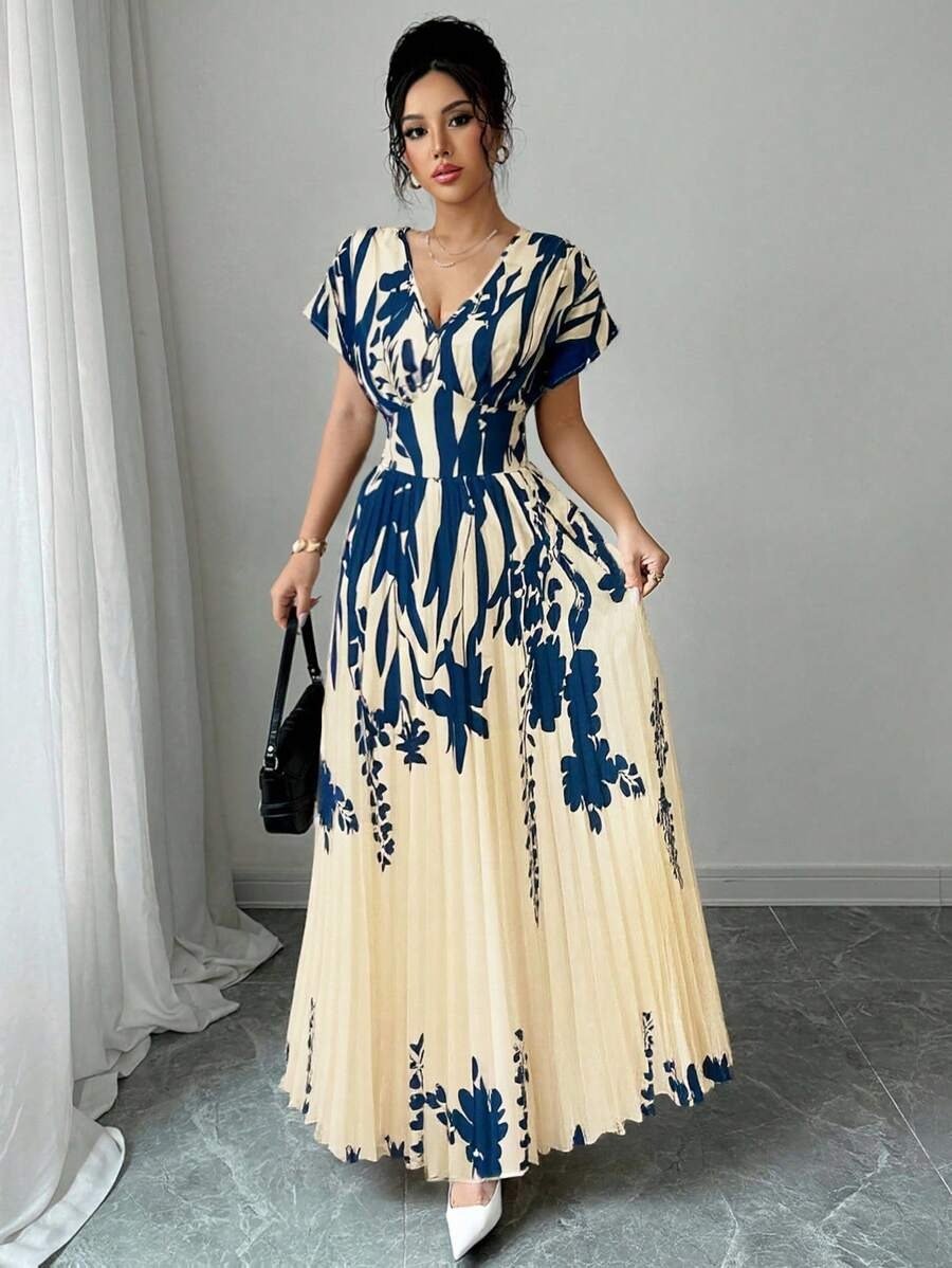 Elenzga Bottom Hem Pleat Structure Strapless, Elastic Waist Dress For Women V-Neck Floral Cinched Waist Flattering Floral Print Long Dress For Women For Spring/Summer, Elegant For Spring/Summer/Fall/Winter Season, Concert Women’s Clothing, Elegant, Evening Gowns, Suitable For Everyday, Commute, Wedding Season/African Dresses For Women/Bandage Dresses/Fall,Back To School