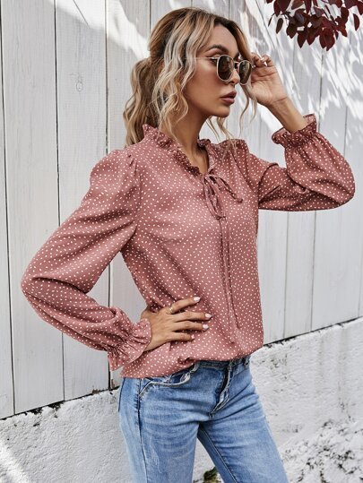 SHEIN All Over Print Tie Neck Flounce Sleeve Blouse