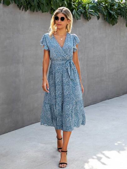 SHEIN Allover Print Butterfly Sleeve Ruffle Hem Belted Dress
