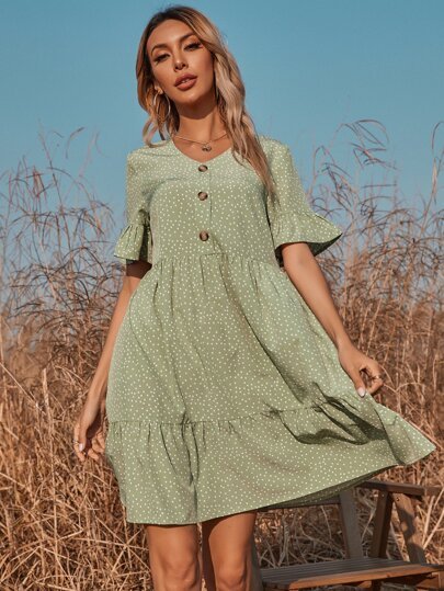 SHEIN Bell Sleeve Ruffle Hem Allover Print Smock Dress