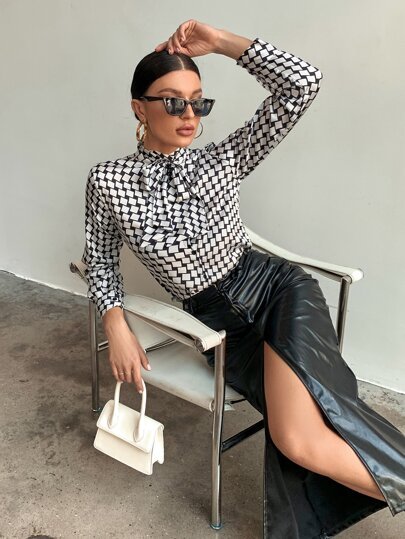 SHEIN BizChic Women’s Black & White Houndstooth Print Bow Tie Shirt, Elegant Long Sleeve Blouse