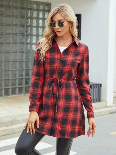 SHEIN Button Front Belted Bow Tied Vintage Plaid Casual Elegant Short Dress