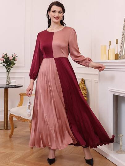 SHEIN Celure Plus Size Solid Color Patchwork Round Neck Long Sleeve Casual Dress