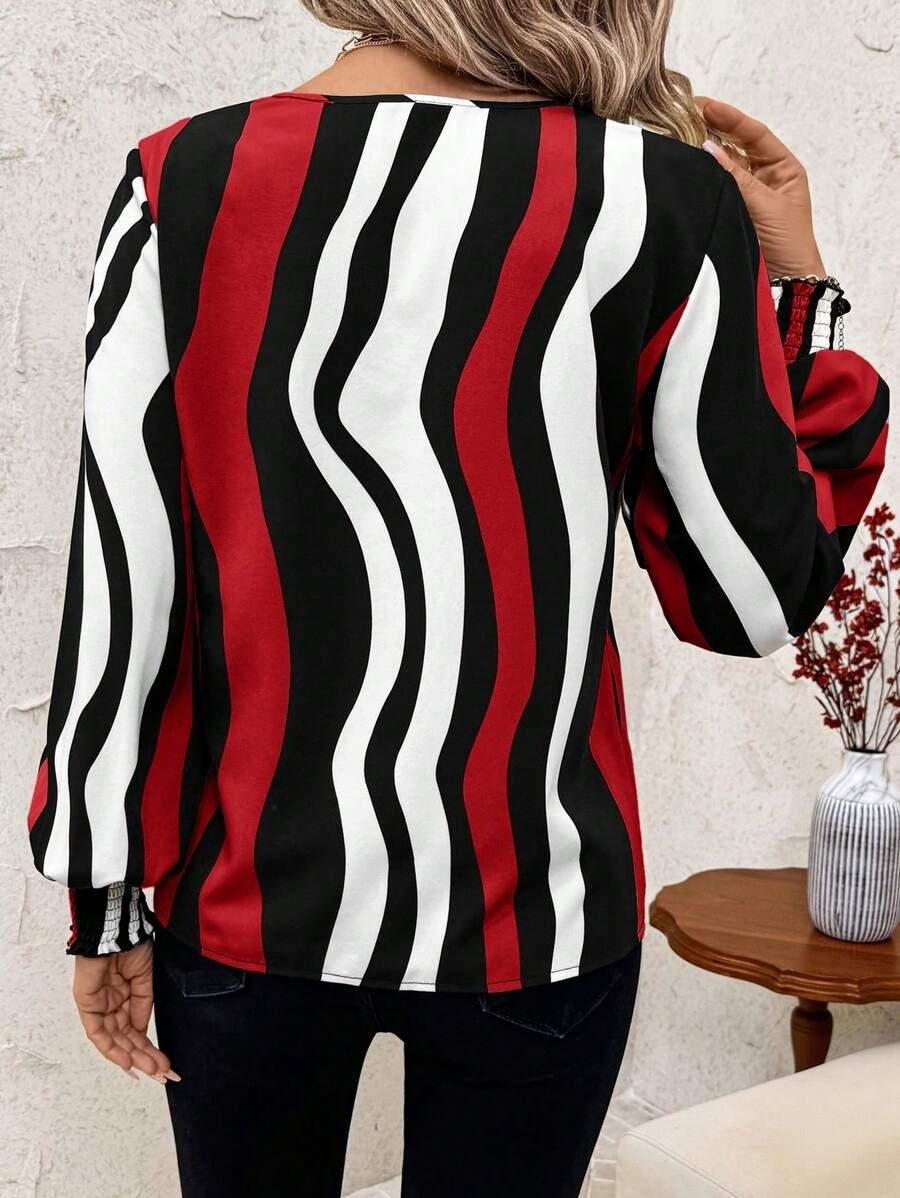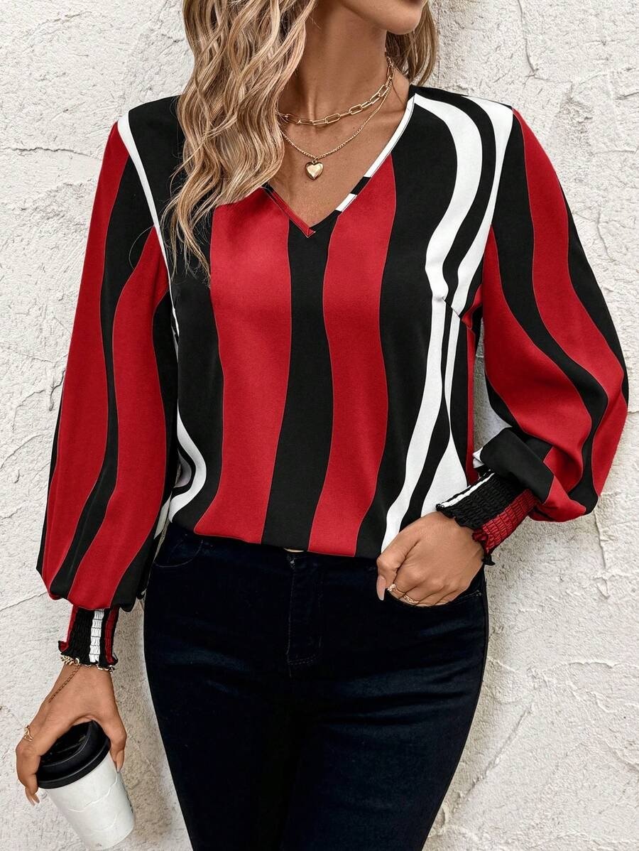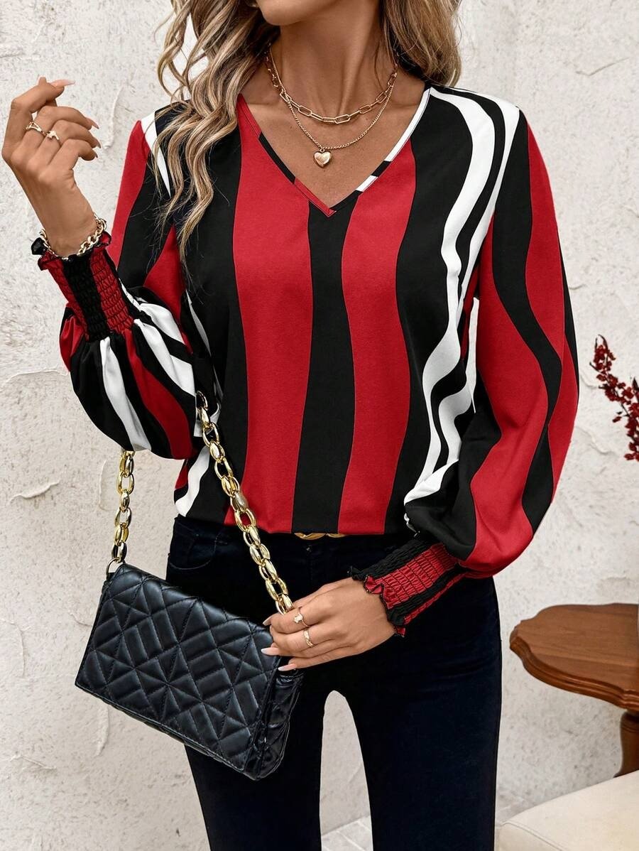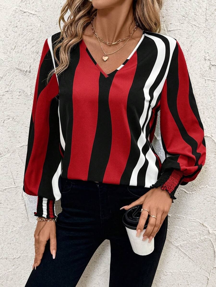 SHEIN Clasi Women’s Striped V-Neck Lantern Sleeve Loose Casual Blouse, Autumn