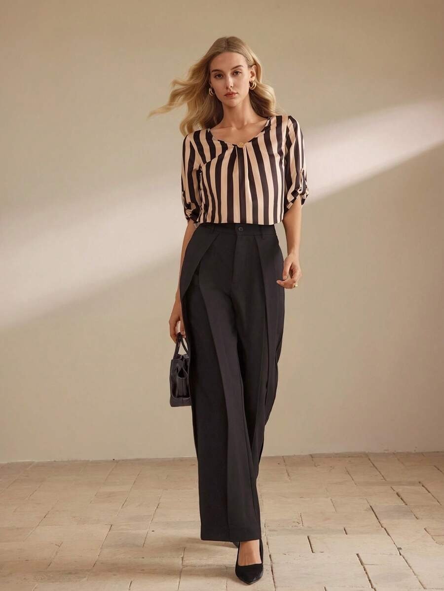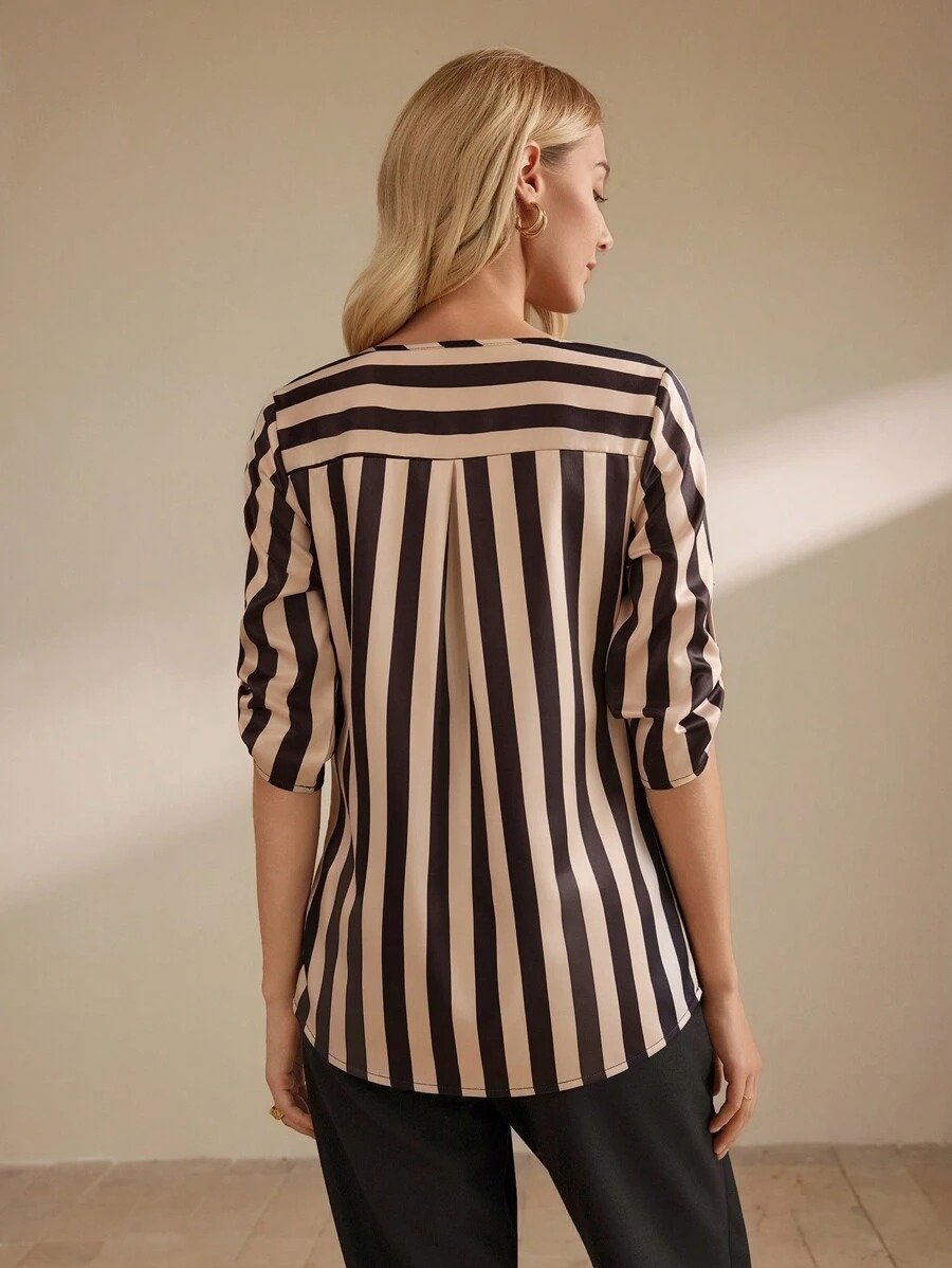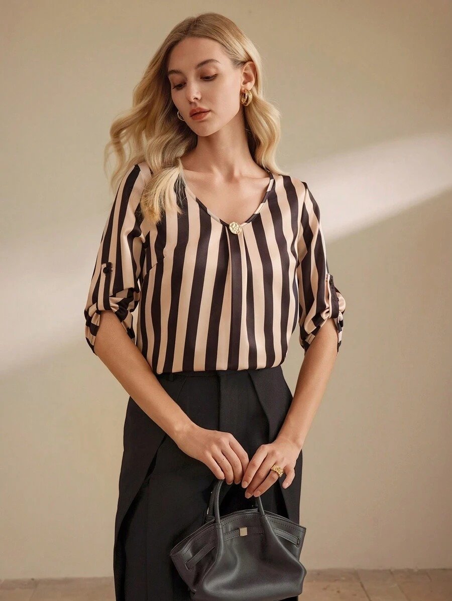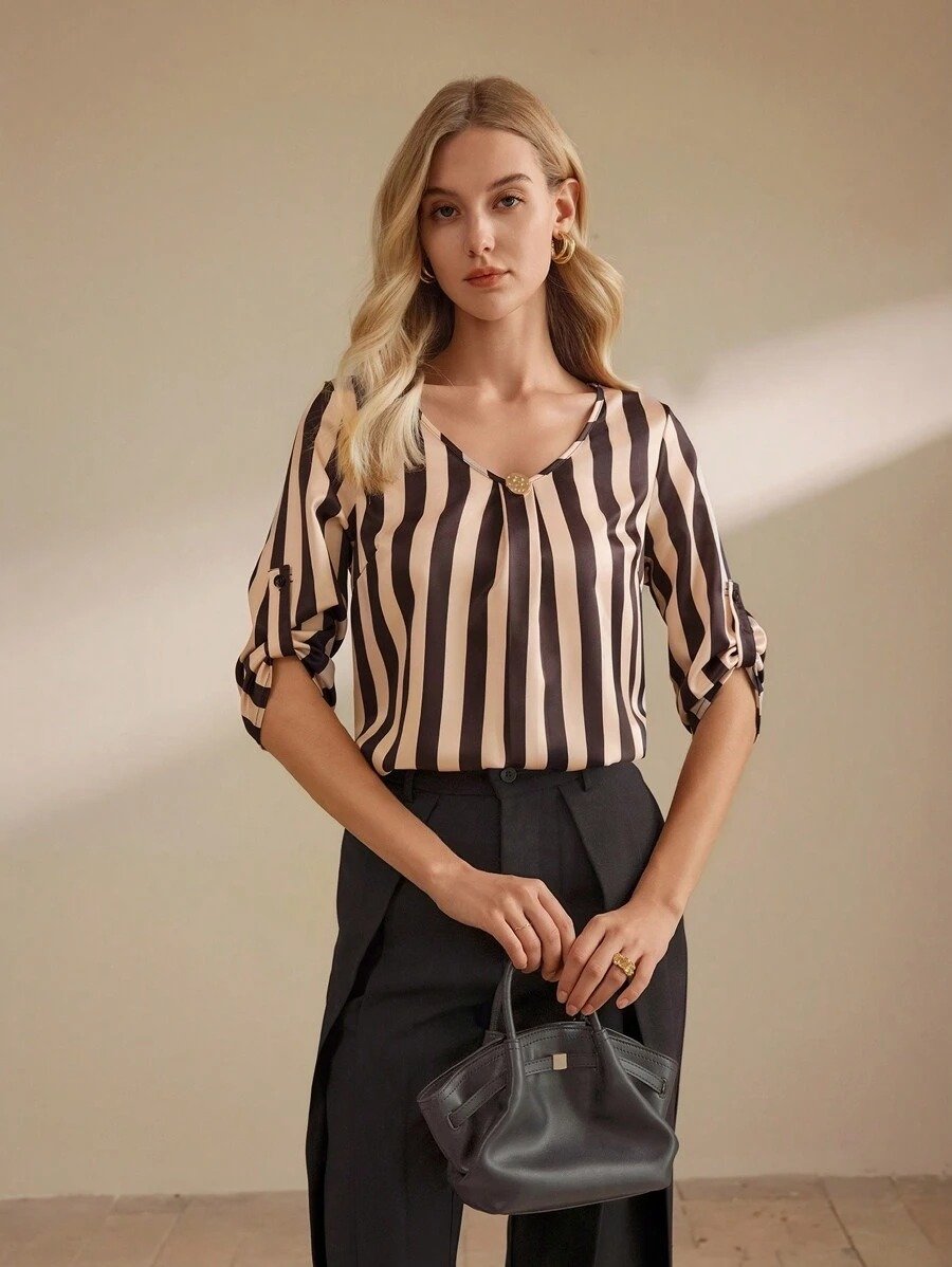 SHEIN Clasi Women’s Striped V-Neck Rolled Cuff Loose Casual Blouse