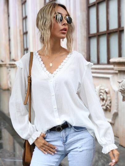 SHEIN Contrast Lace Ruffle Trim Oversized Blouse