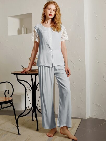 SHEIN Contrast Lace Sleeve Button Front Top & Pajama Set