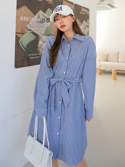 SHEIN DAZY Striped Print Drop Shoulder Belted Shirt Dress