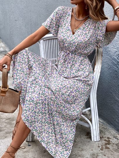 SHEIN Ditsy Floral Drawstring Waist Dress
