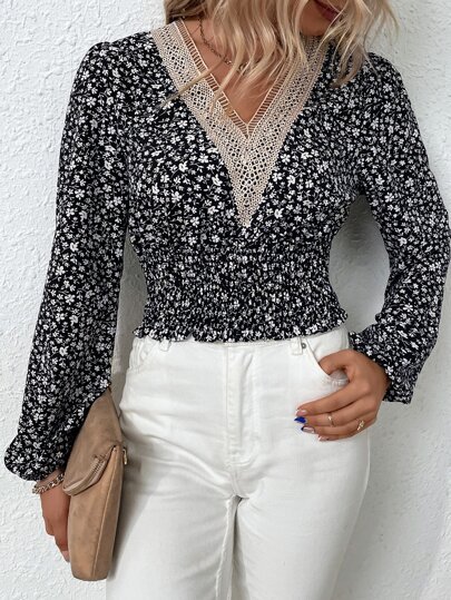 SHEIN Ditsy Floral V Neck Lace Front Blouse