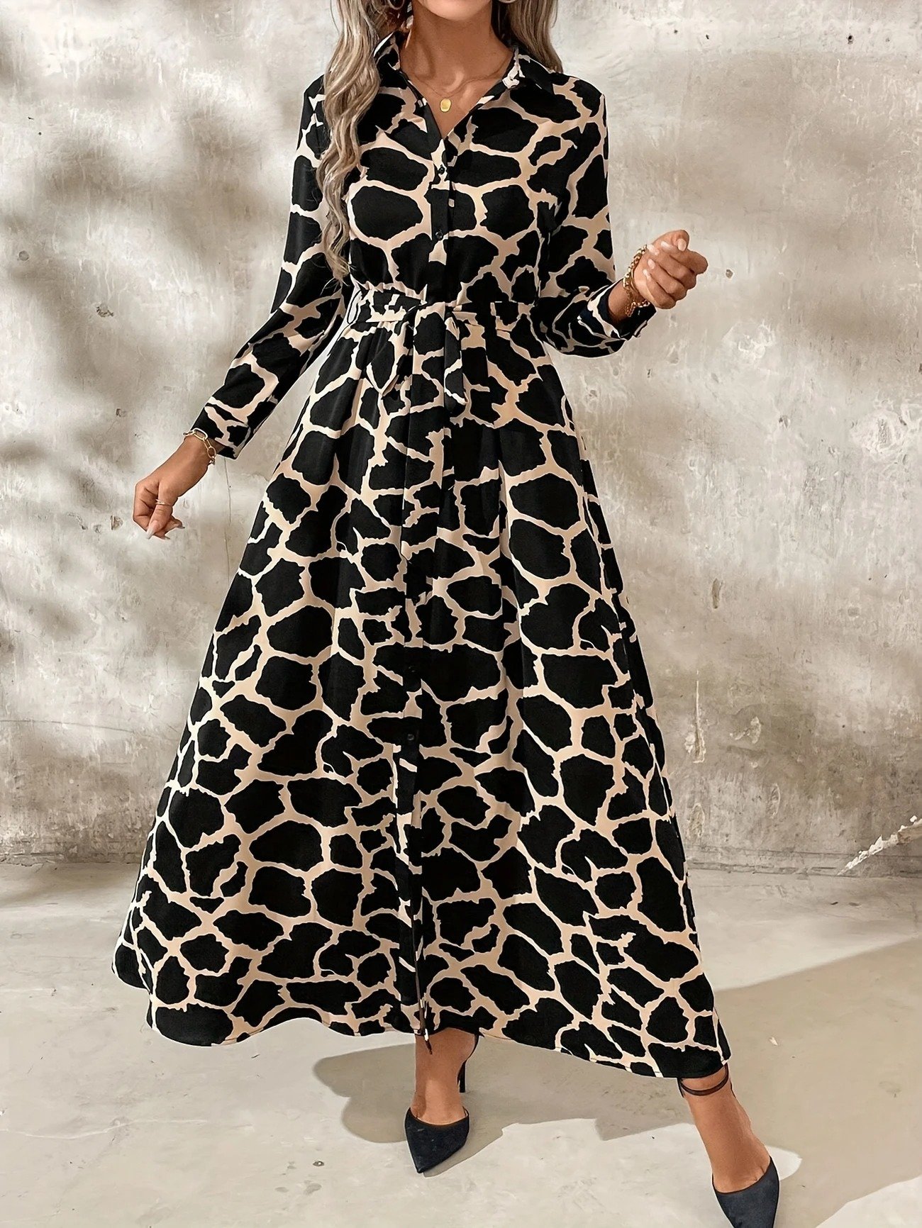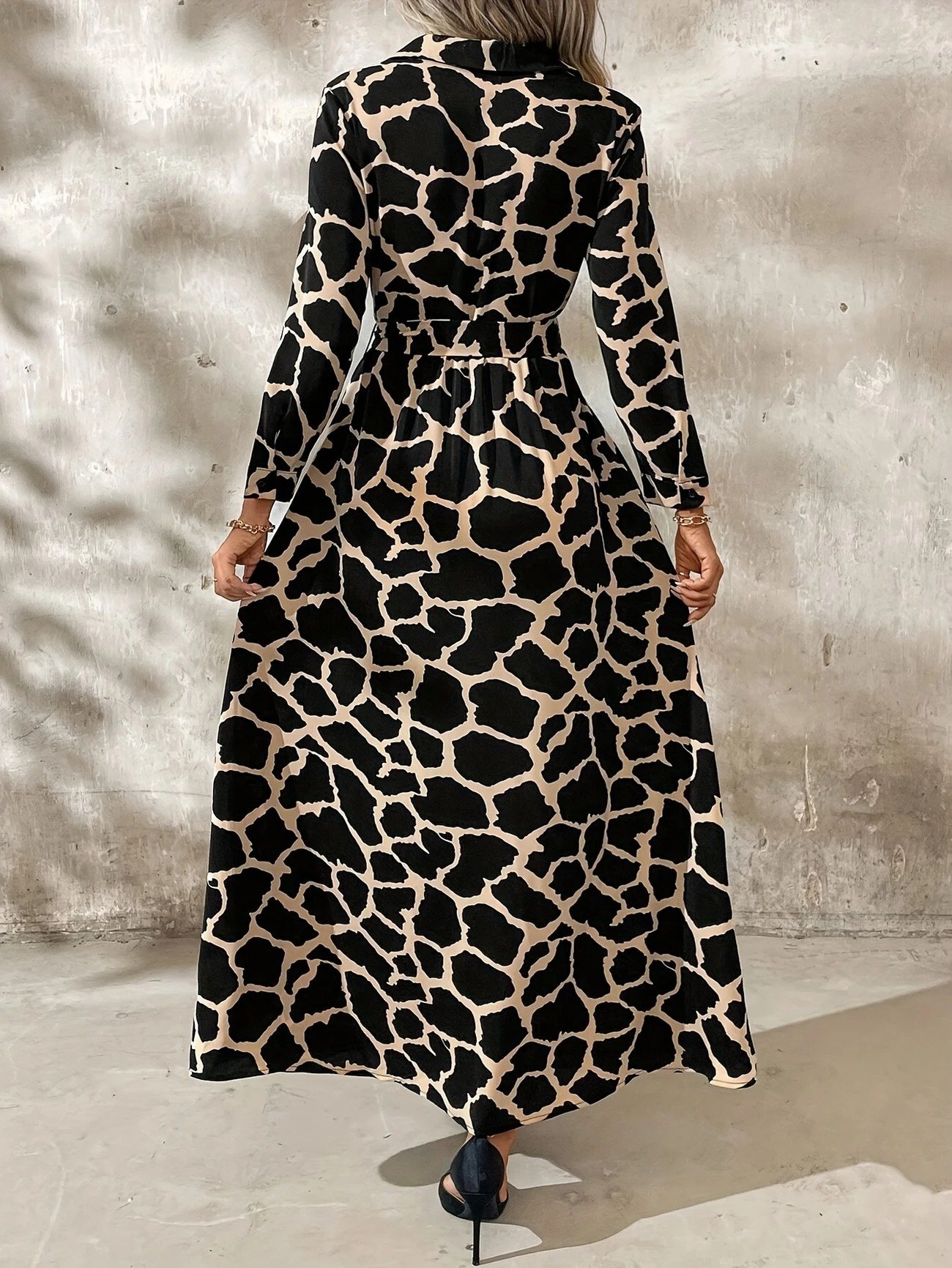 SHEIN Elegant Leopard Print Long Sleeve Dress for Women – Chic Button Detail, Non-Stretch Polyester, Machine Washable – All Seasons