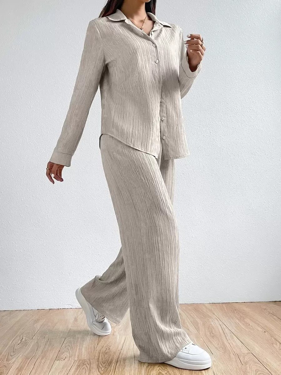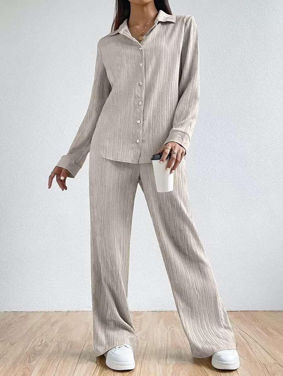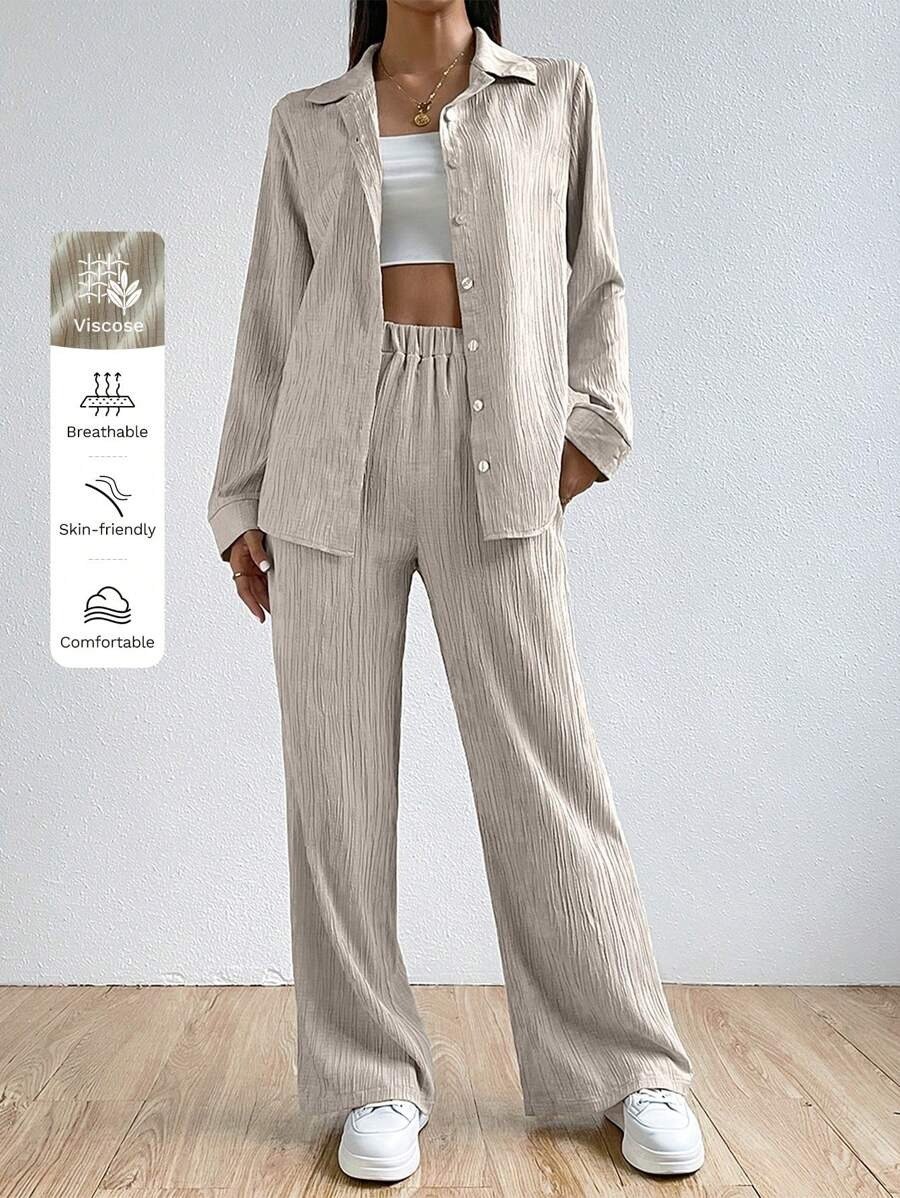Be the first to review “SHEIN EZwear Lapel Neck Crop Shirt & Wide Leg Pants Without Cami Top”