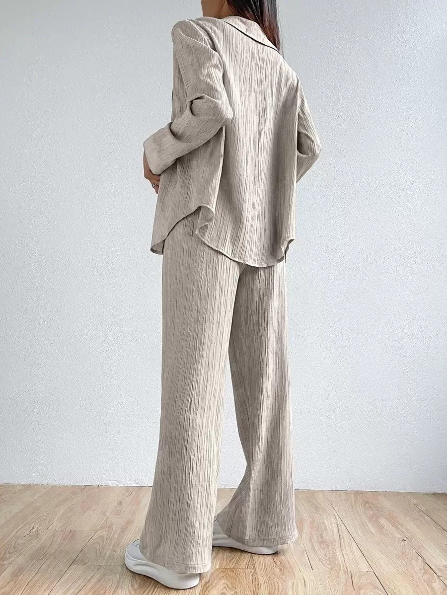 SHEIN EZwear Lapel Neck Crop Shirt & Wide Leg Pants Without Cami Top