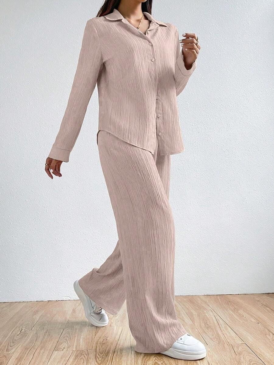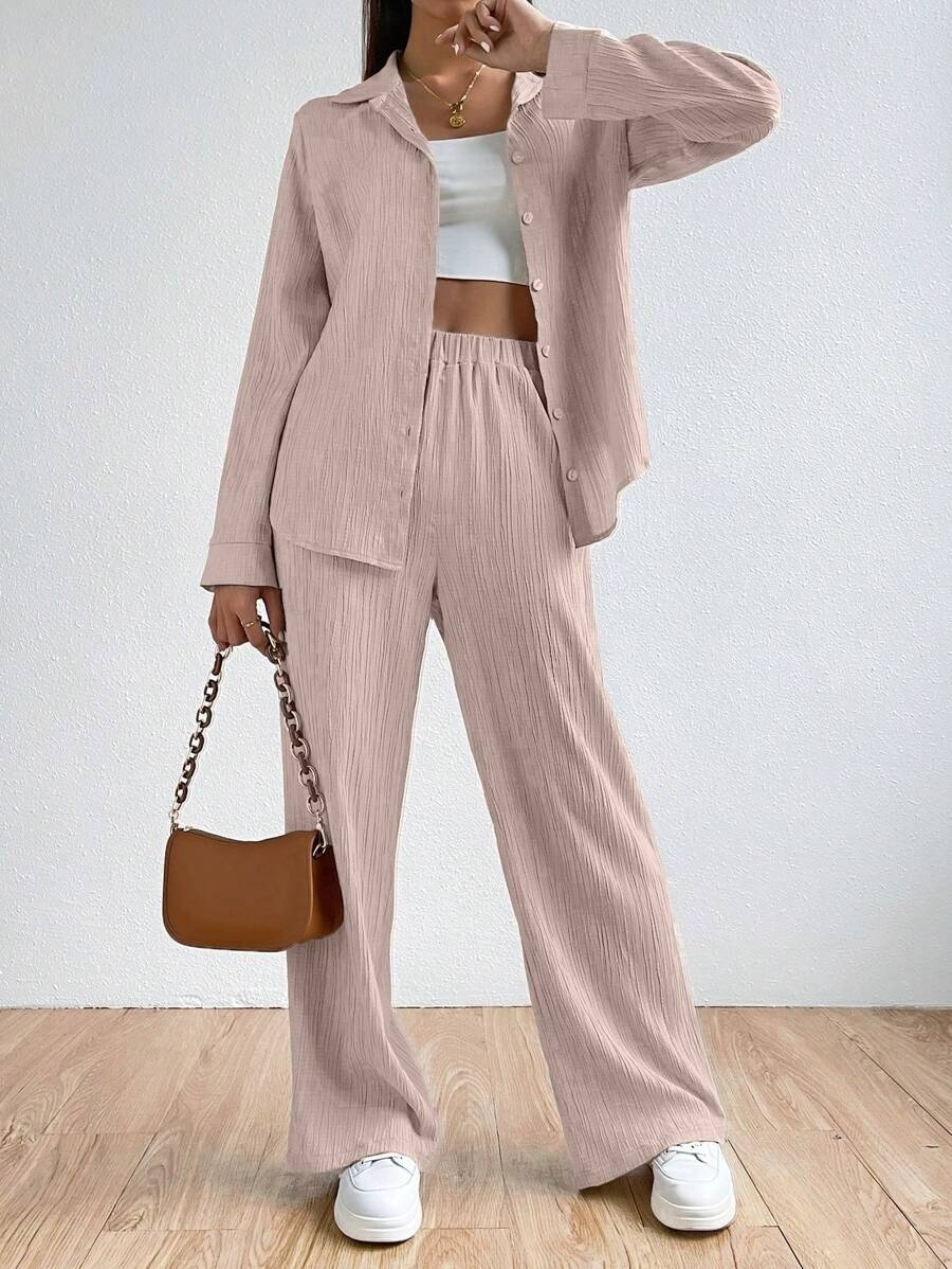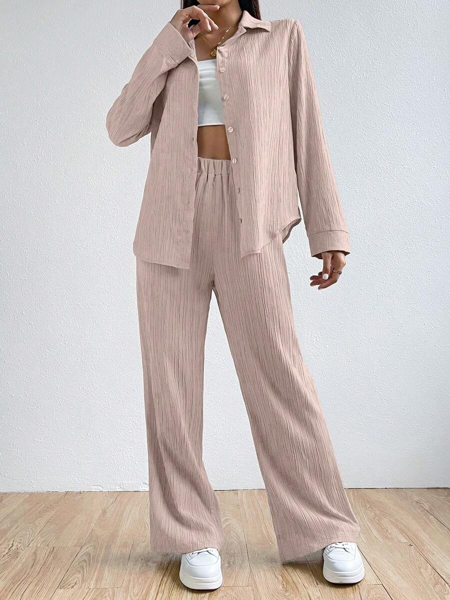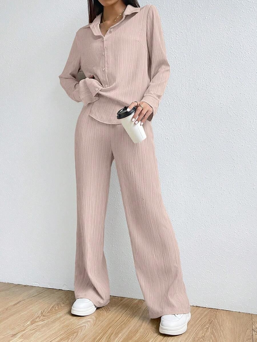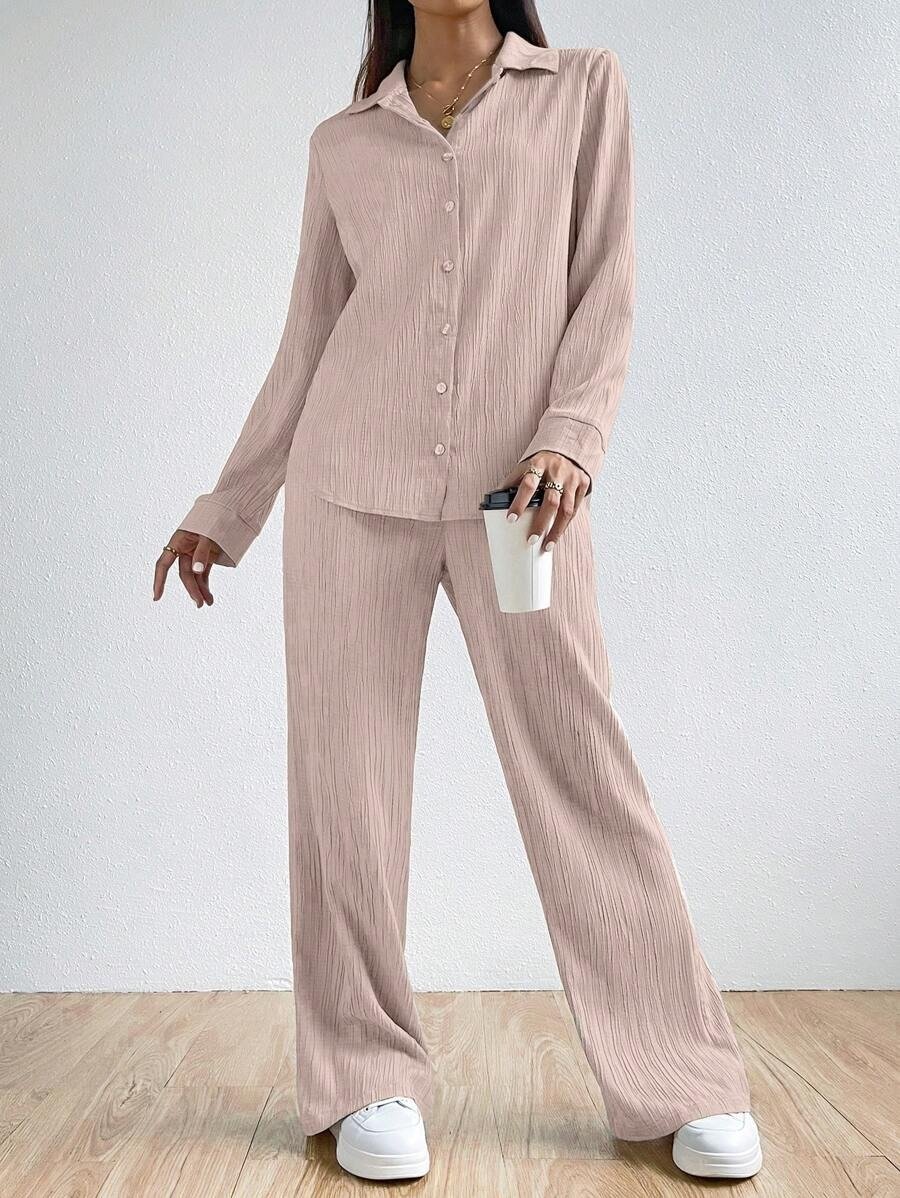 SHEIN EZwear Solid Color Textured Button-Up Embroidered Shirt And Straight-Leg Pants