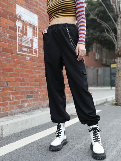 SHEIN Flirla Plus Flap Pocket Side Buckled Belted Cargo Pants With Chain