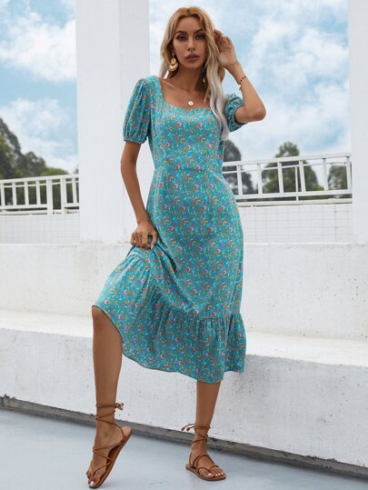 SHEIN Floral Neck Dress Boho Casual Short Sleeve