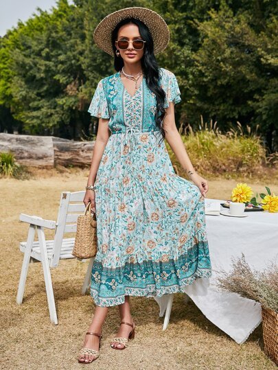 SHEIN Floral Print Flowy Drawstring Waist Dress