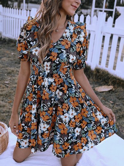 SHEIN Floral Print Shirred Waist Tie Back Dress