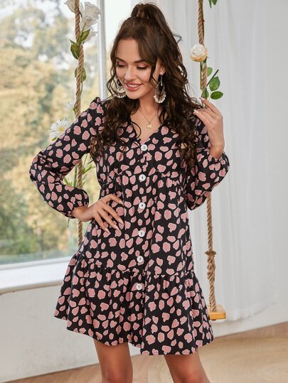 SHEIN Floral V Neck Button Front Tea Dress