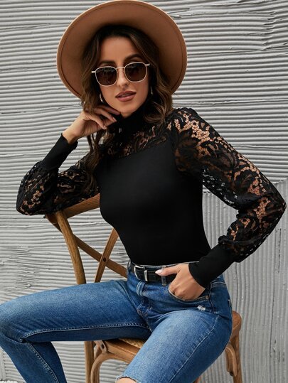 SHEIN Frenchy Women Elegant Lace Spliced Long-Sleeve Fitted Knit T-Shirt With Ruffled Neckline