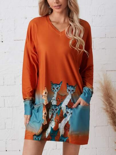 SHEIN Full Sleeve Cat Print T Shirt Dress