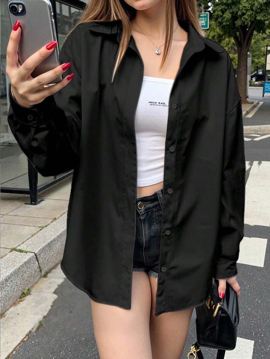 SHEIN INAWLY Women’s Solid Color Single-Breasted Casual Loose Long Sleeve Shirt