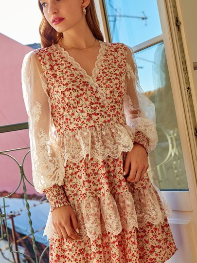 SHEIN Lace Panel Floral Print A-line Dress