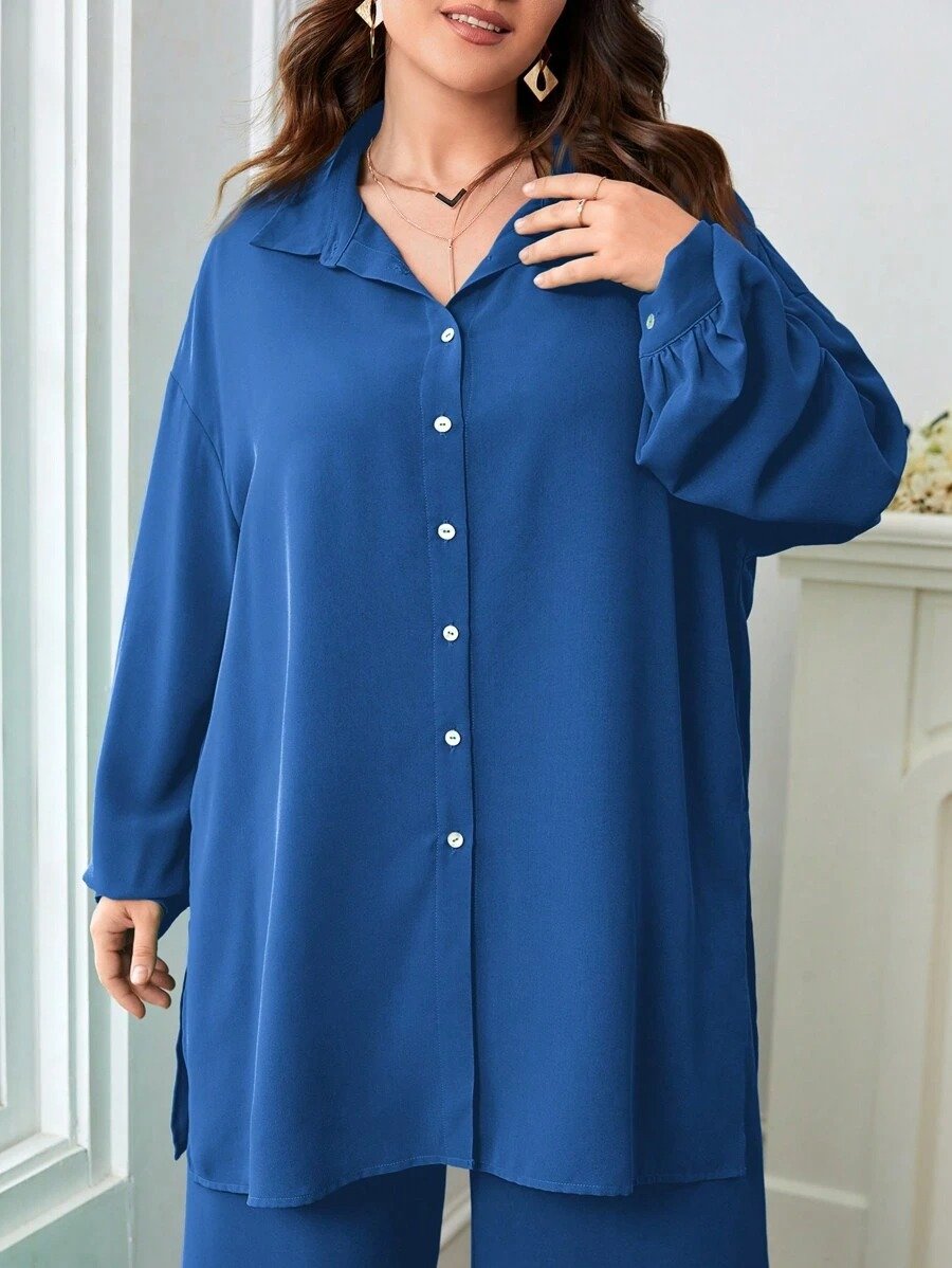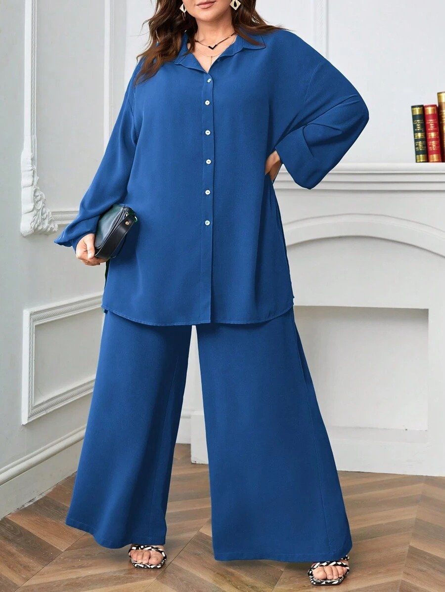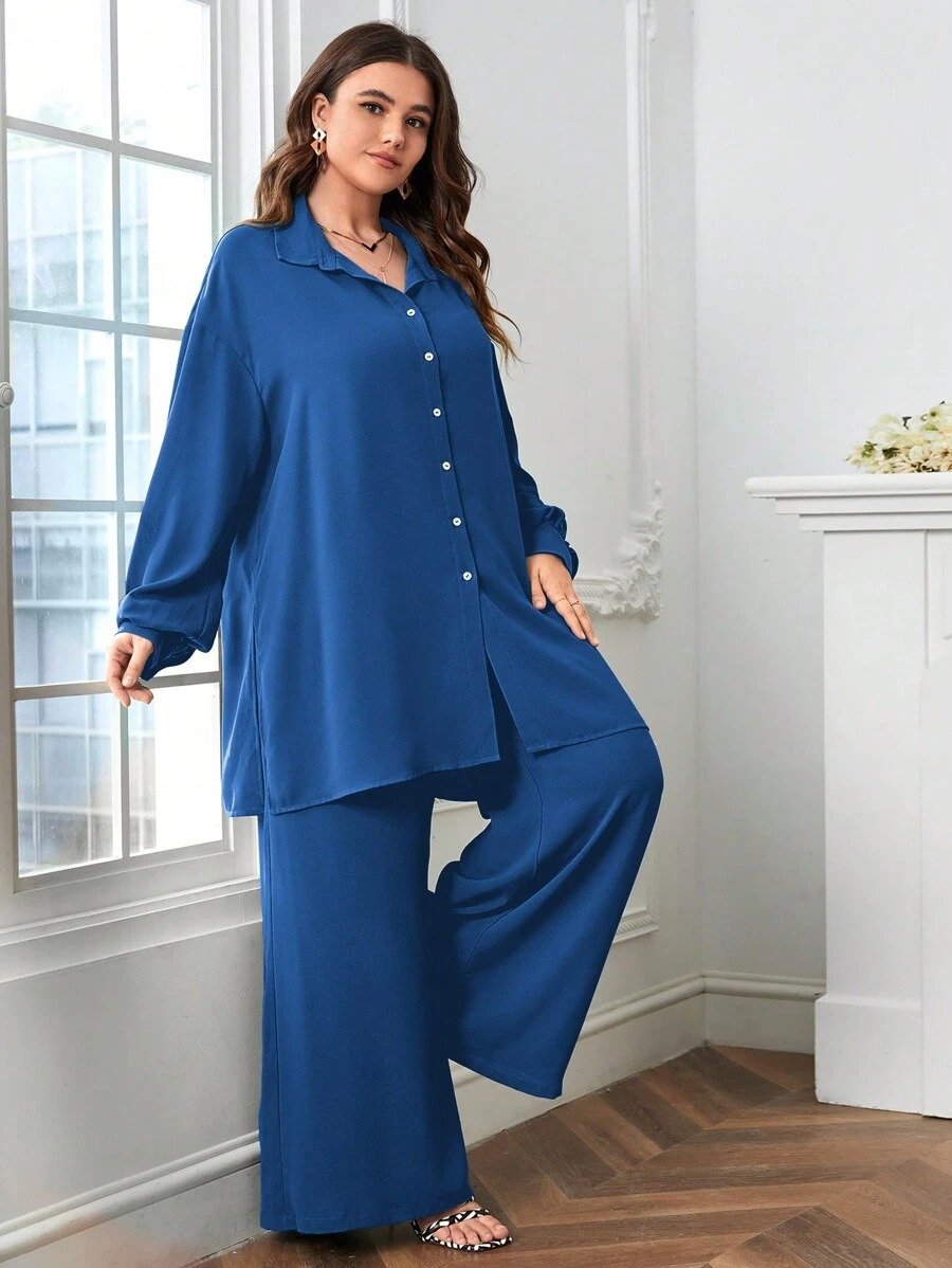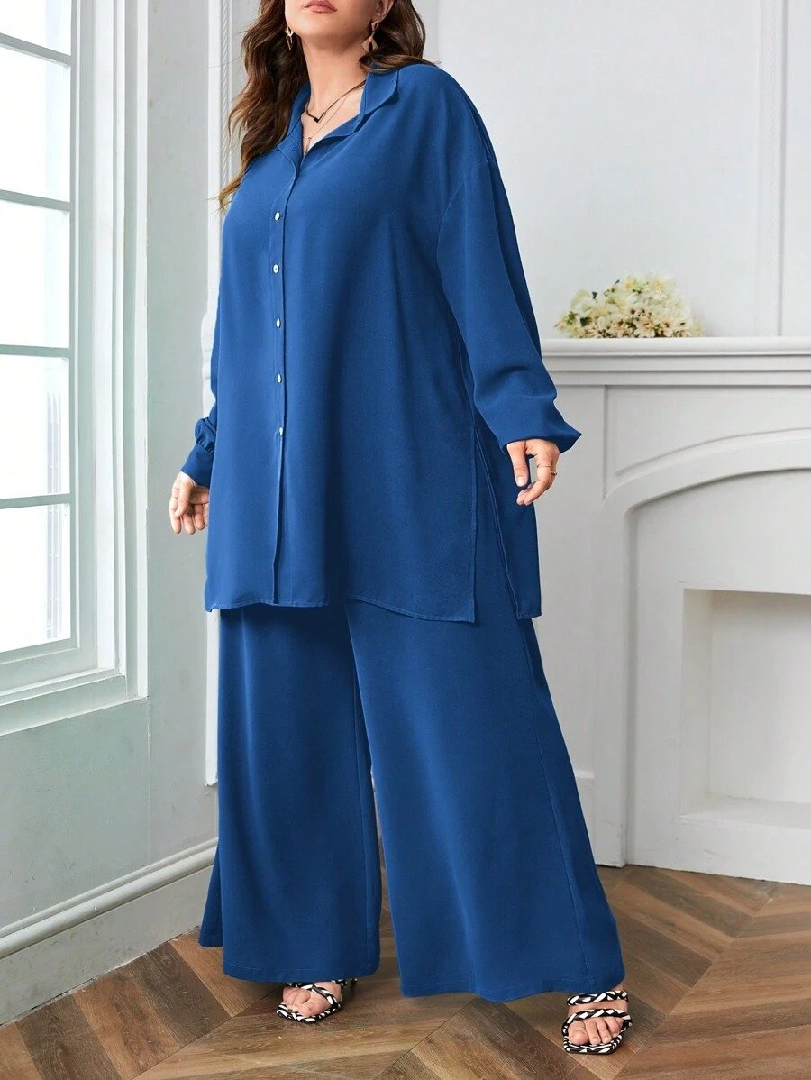 SHEIN LUNE Plus Size Loose Fit Long Sleeve Shirt And Wide-Leg Pants 2-Piece Set