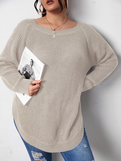 SHEIN LUNE Plus Solid Raglan Sleeve Curved Hem Sweater