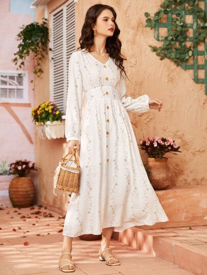 SHEIN Mulvari Plants Print Button Front Gathered Waist A-line Dress