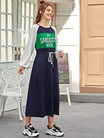 SHEIN Mulvari Striped & Letter Graphic Round Neck Drawstring Waist Dress