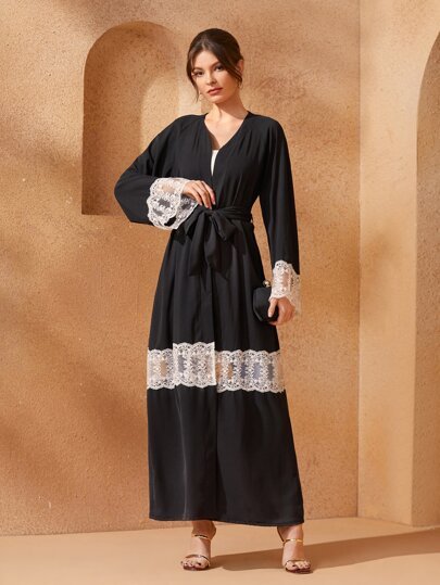 SHEIN Najma CURVE Lace Trim Split Belted Abaya
