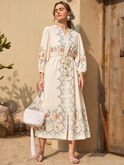 SHEIN Notch Neck Lantern Sleeve Floral Print Belted Dress