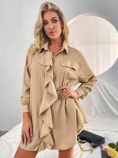SHEIN Oversized Tunic With Frill Details Pocket Front Shirt