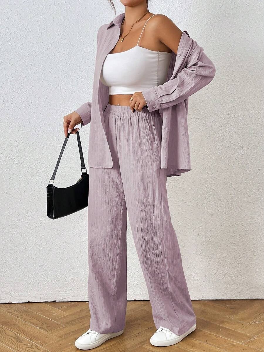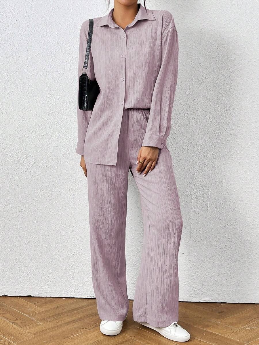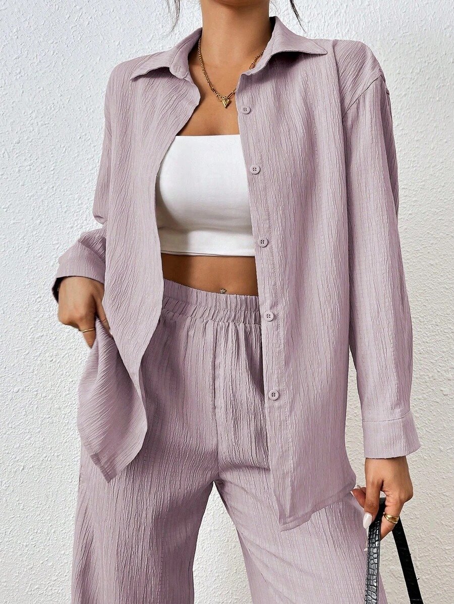 SHEIN PETITE 2 Pieces Women Solid Color Long Sleeve Shirt And Long Pants Set, Minimalist And Fashionable, Suitable For Summer