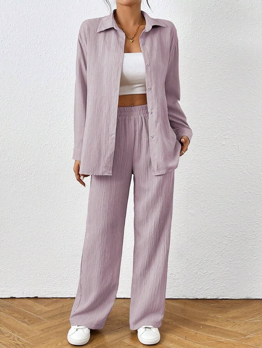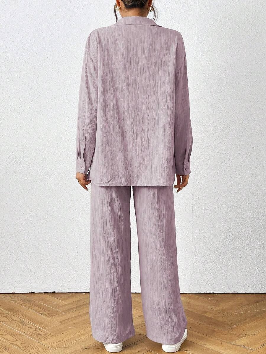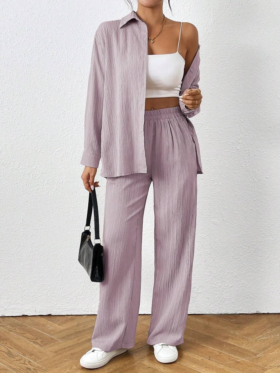 SHEIN PETITE 2 Pieces Women Solid Color Long Sleeve Shirt And Long Pants Set, Minimalist And Fashionable, Suitable For Summer