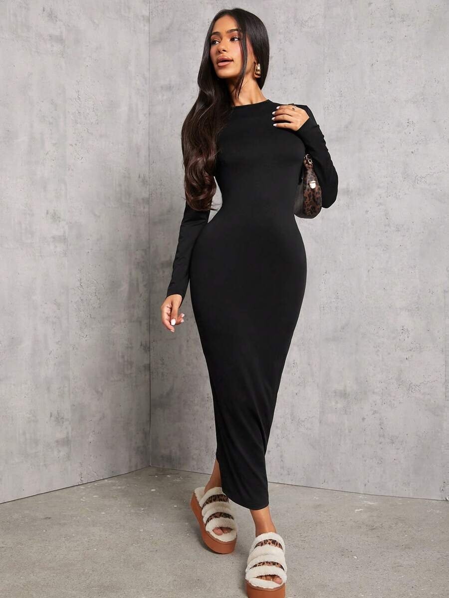 SHEIN PETITE Solid Color Pleated Waist Black Long Sleeve Dress