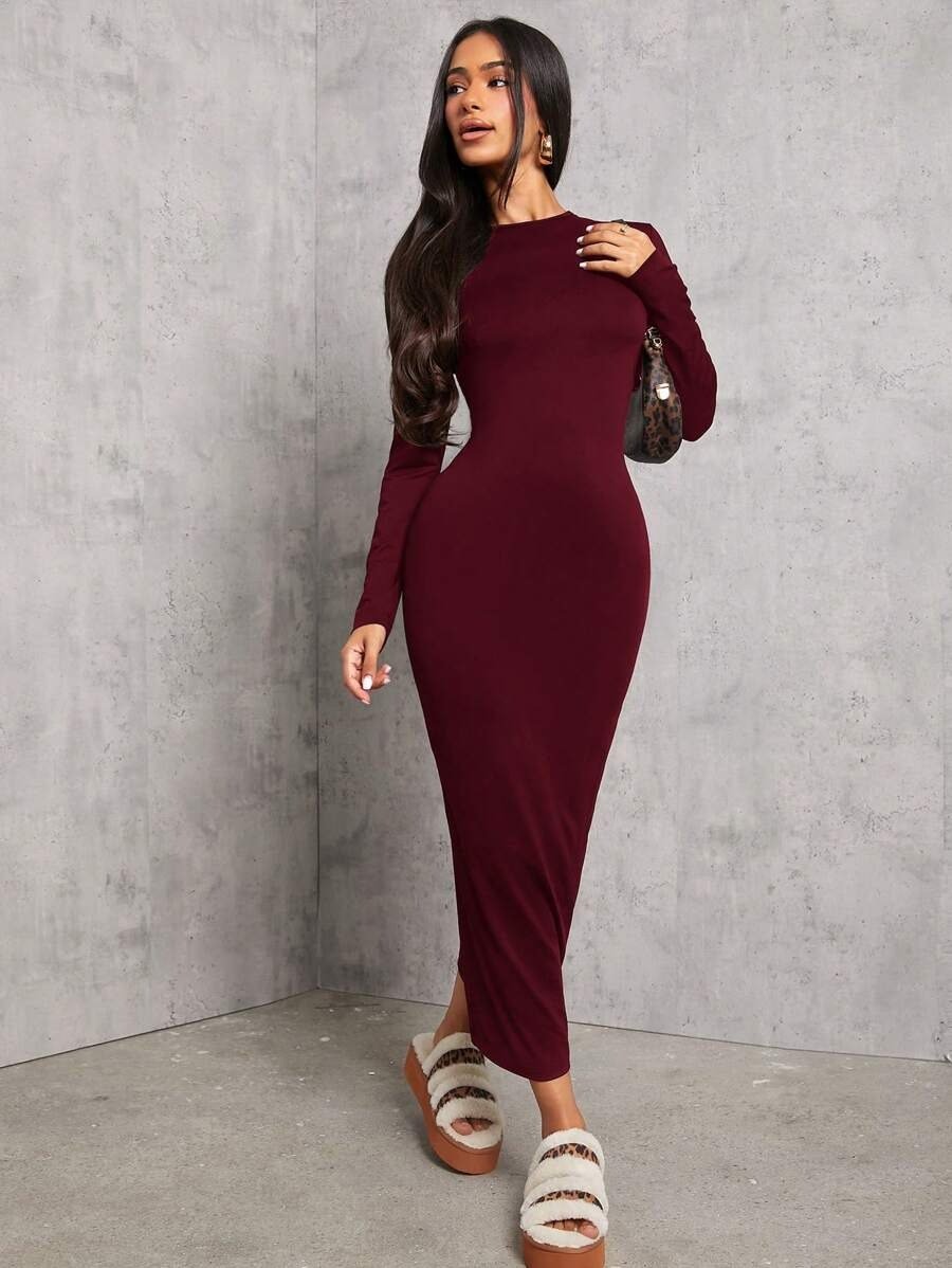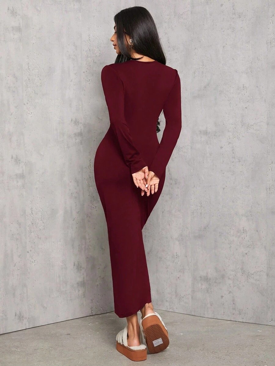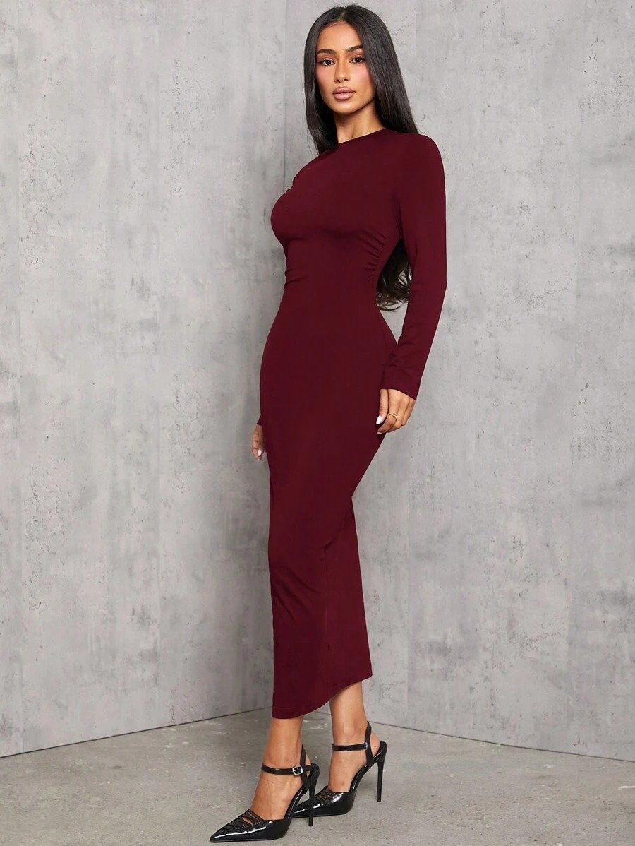 SHEIN PETITE Solid Color Pleated Waist Bodycon Long Sleeve Dress