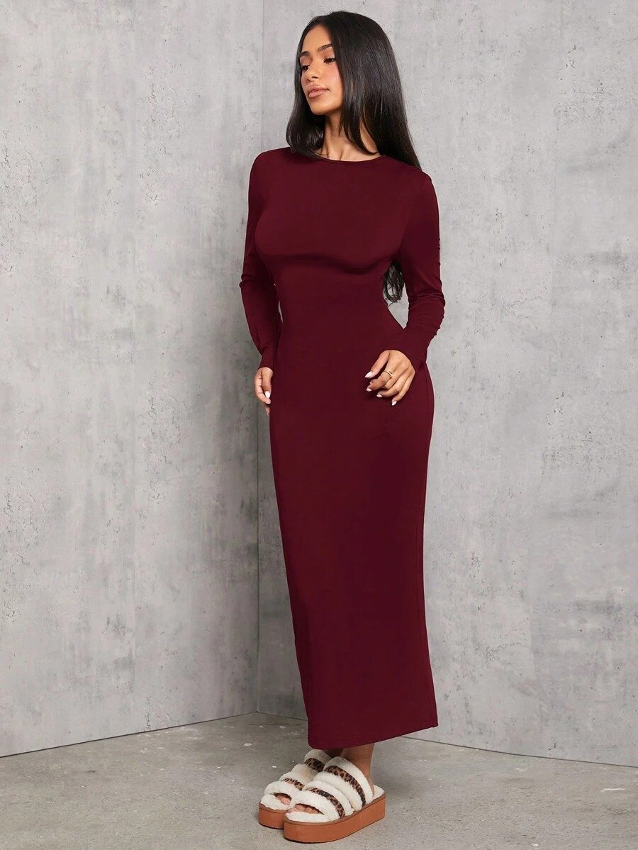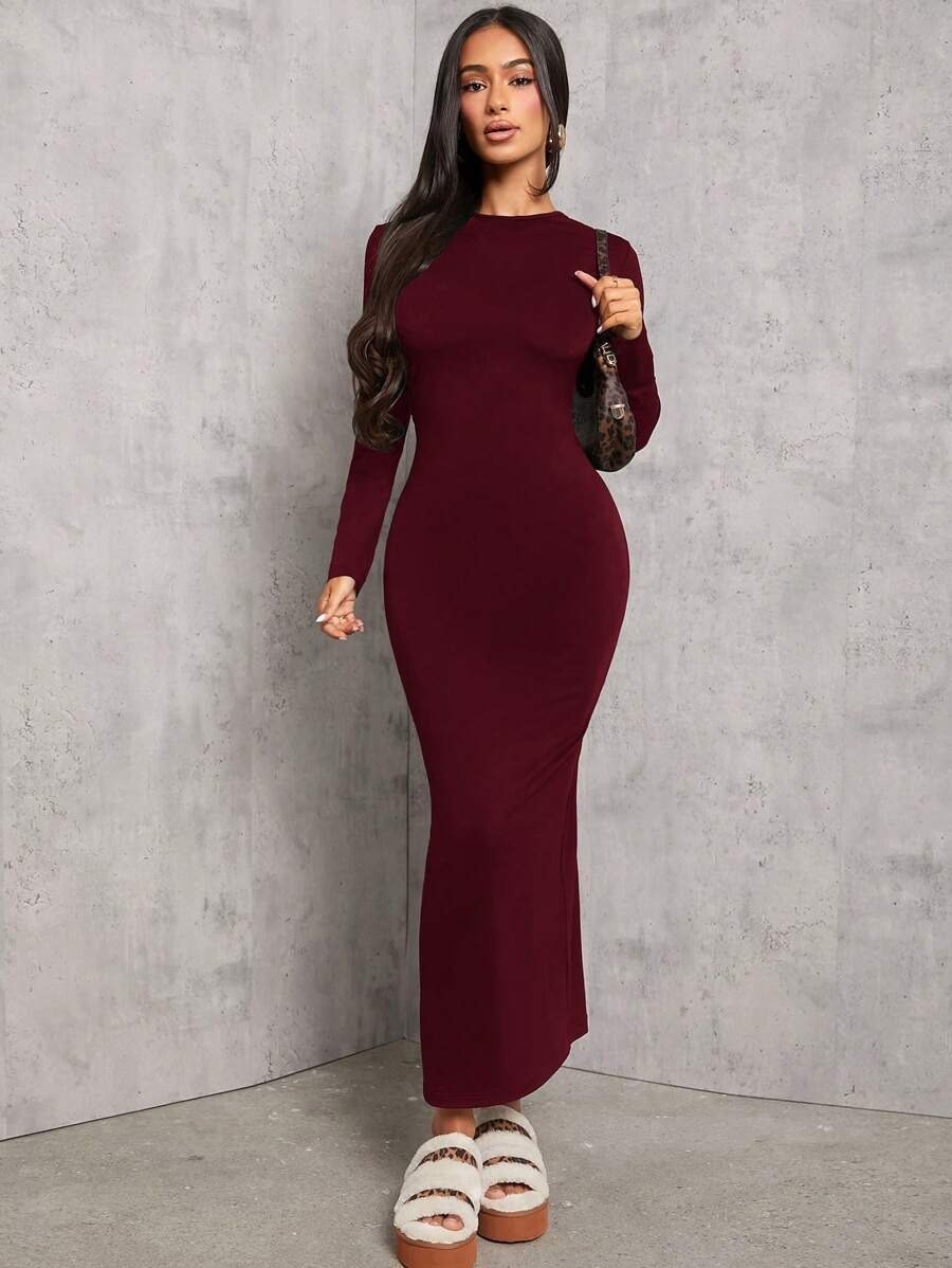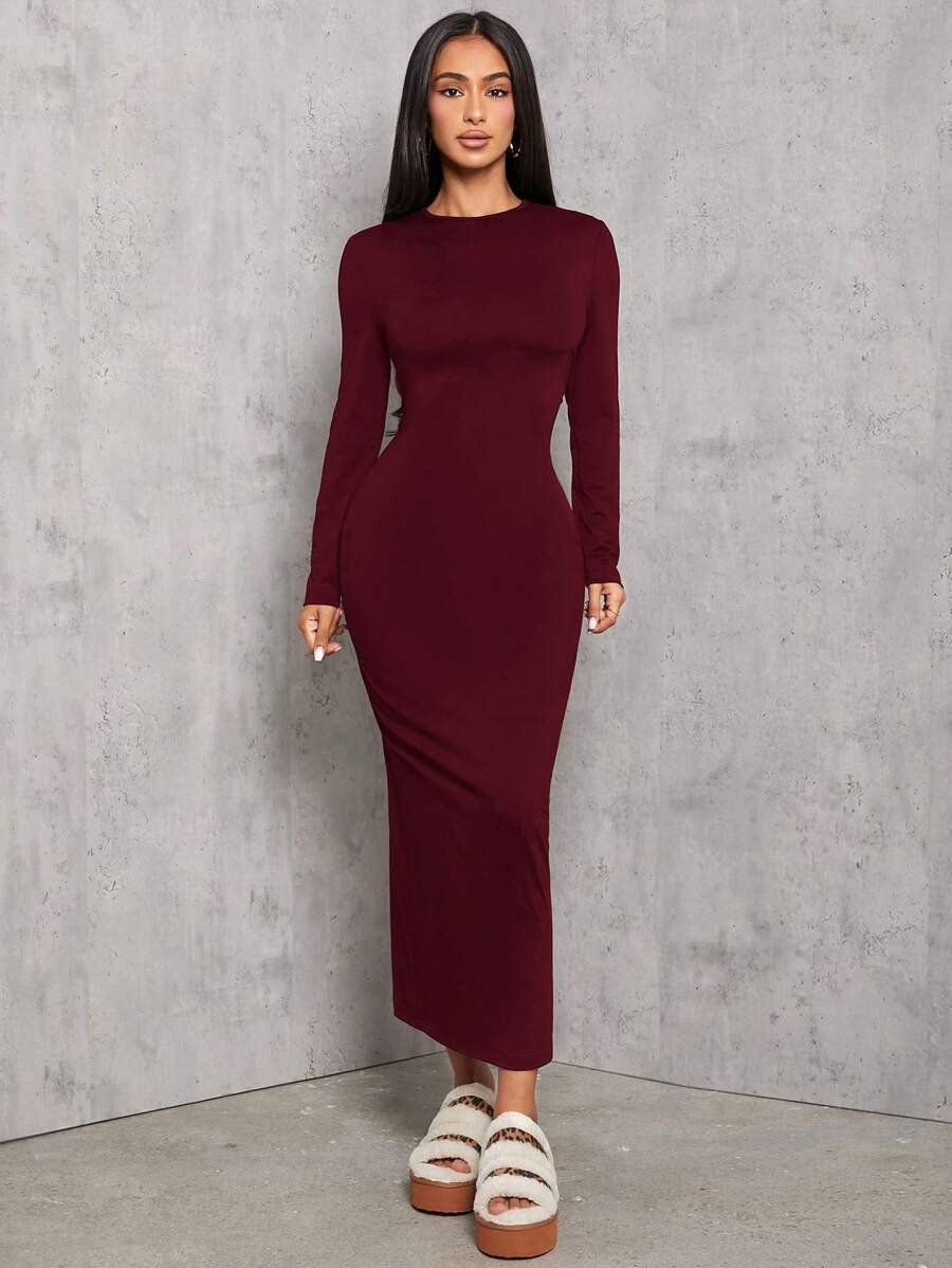 SHEIN PETITE Solid Color Pleated Waist Bodycon Long Sleeve Dress