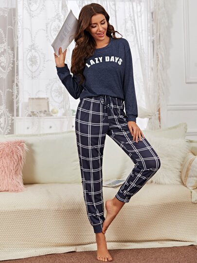 SHEIN Plaid & Slogan Graphic Pajama Set