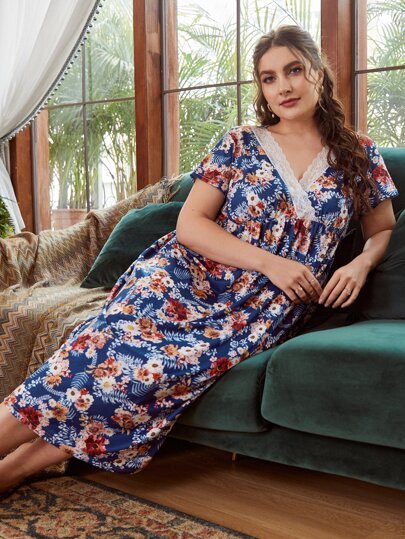SHEIN Plus Floral Print Lace Trim Nightdress
