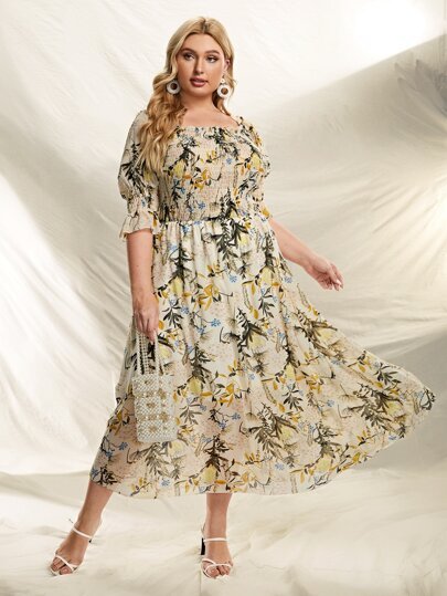 SHEIN Plus Floral Print Square Neck Shirred Chiffon Dress