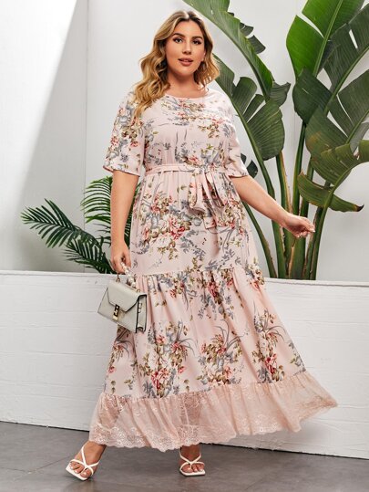 SHEIN Plus Lace Ruffle Hem Floral Belted Dress