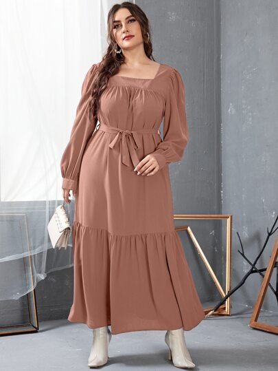 SHEIN Plus Square Neck Belted Ruffle Hem Dress