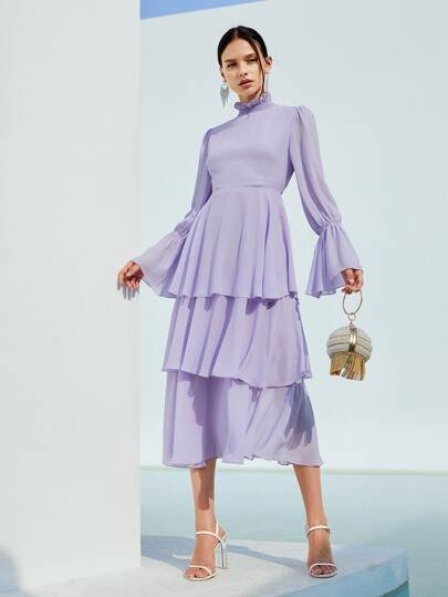 SHEIN Shirred Neck Flounce Sleeve Layered Dress