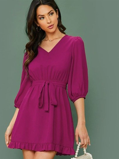 SHEIN Solid Color Half Sleeve V-Neck Belted Dress