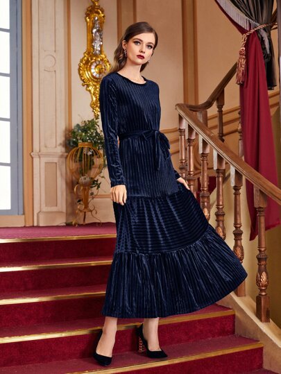 SHEIN Solid Ripped Ruffle Hem Belted Velvet Dress